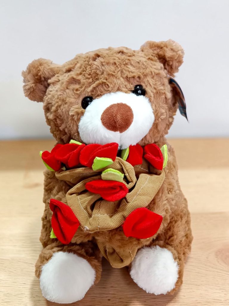 Tierno osito de peluche de tamaño mediano que incluye un pequeño ramo de rosas. Su suavidad y diseño lo convierten en el detalle perfecto para sorprender y expresar amor en cualquier ocasión.